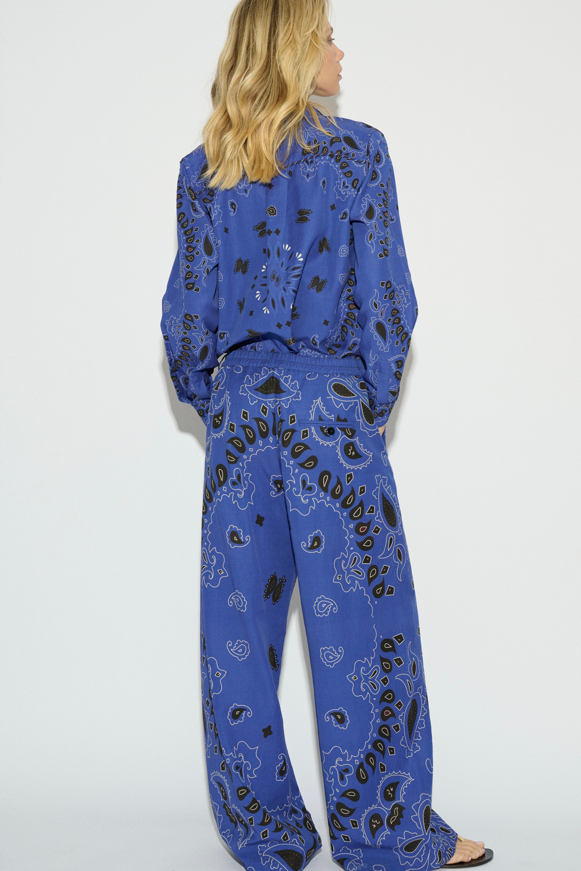 Camisa con cuello solapa y manga larga acaba en puño, con botonadura central. Tapeta y puño con vivo a contraste. Tejido de mezcla liocell y estampado paisley.